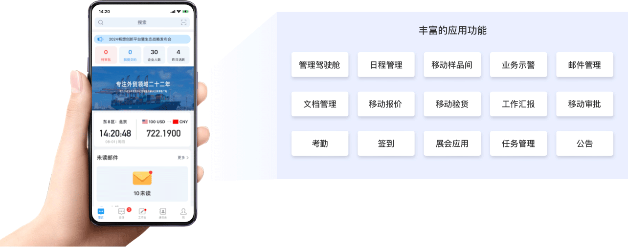 專為外貿(mào)企業(yè)打造的移動APP,讓管理者隨時隨地管理外貿(mào)業(yè)務(wù)??蛻簟⒐S、合同、訂單實時查詢,工作任務(wù)自動提醒,為工作設(shè)計的企業(yè)即時通訊、快速審批一手搞定、展會現(xiàn)場快速報價、任務(wù)分解進(jìn)度可控、豐富的企業(yè)內(nèi)部大數(shù)據(jù)分析。
